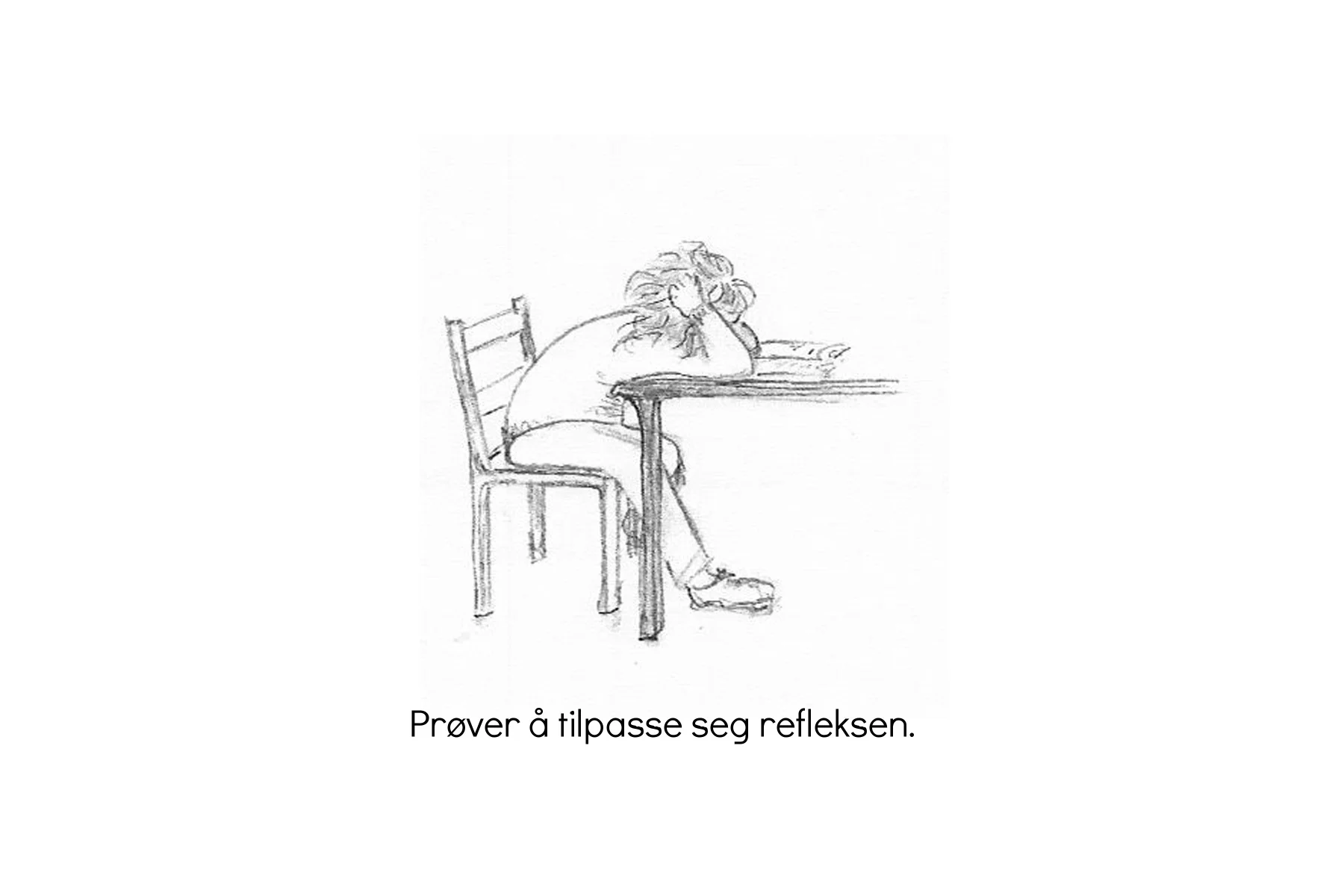 FOR BARNET KAN DET VÆRE VANSKELIG Å SETTE SEG ENKELT OG GREIT PÅ STOLEN. Kroppen reagerer på hodebevegelsene og barnet må arbeide for å klare av det meste, som egentlig skulle være lett. Og hun vet ikke om det, at hun har vansker som kanskje hennes klassekamerater ikke har. Er det rart barnet sliter? Her kan du oppleve det "uryddige" barnet, barnet som konstant spriker med hodet bakover og bena strukket ut. Du kan se barnet hvis hode faller ned mot pulten ved skriving, som støtter hodet med den ikke skrivende hånden, som skriver ekstremt sakte av fra tavlen og skriver feil. Bokstaver og tall speilvendes. Sally Goddard, Reflexes, learning and behavior, A Window Into the Child’s Mind.2002, p.18